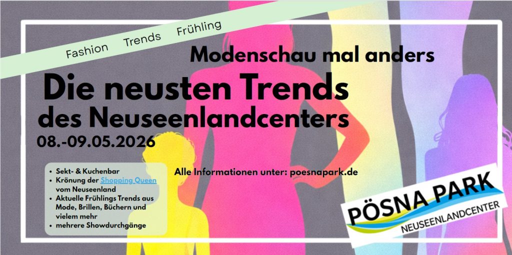 Shopping Queen im Pösna Park Am 09. Mai 2026 ab 10 Uhr wird im Pösna Park die Shopping Queen gesucht. Drei ausgewählte Teilnehmerinnen erhalten jeweils 500 € Shoppingbudget und haben 3 Stunden Zeit, um passend zu einem vorgegebenen Motto ein komplettes Outfit im Center zu shoppen. Anschließend präsentieren diese ihre Looks bei einer großen Modenschau, […]
