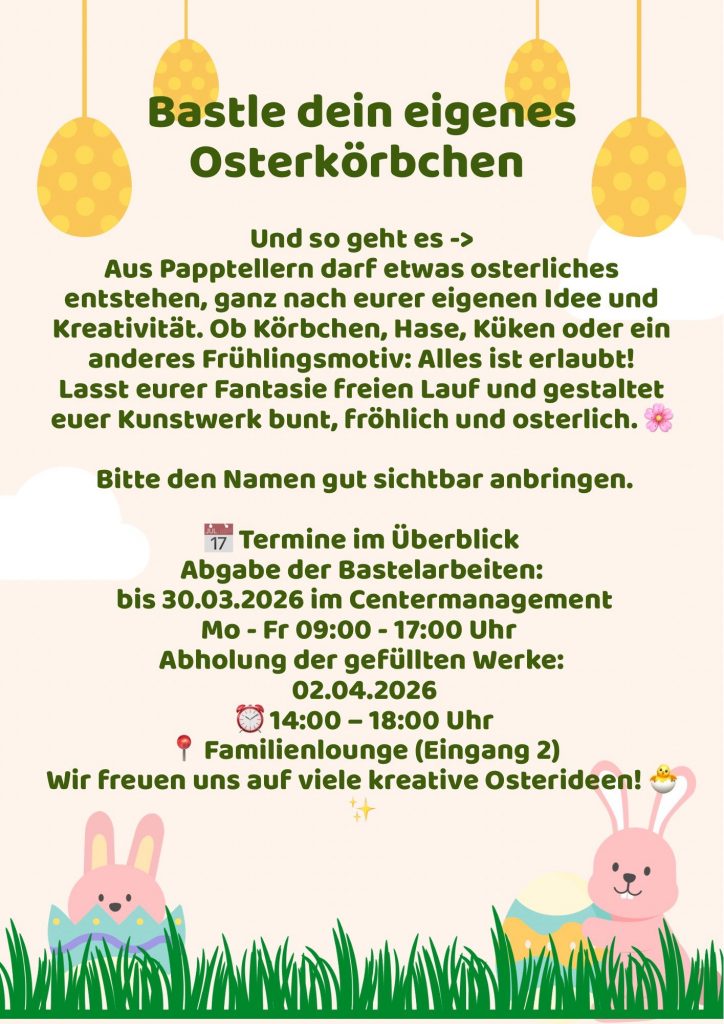 Die gefüllten Osterüberraschungen warten dann am 2. April 2026 von 14–18 Uhr in der Familienlounge (Eingang 2) auf ihre Abholung.